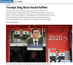 Da ist Donald Trump ein wirklicher Lichtblick. Er versteht die simpelste Sache der Welt. Es bringt nichts, jemanden „weg“ zu wünschen, zu bomben oder höchst zweifelhafte Kämpfer zu unterstützen, wenn man niemanden hat, der ein von allen akzeptierter Führer des Landes sein könnte.