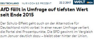 Oben rechts berichtet WELTonline vom „tiefsten Wert=8,5 %“ seit 2015 bei der AfD. Allensbach hat das Ergebnis vom 1 bis 15. 2.2017 erhoben und am 22.2.2017 veröffentlicht. INSA hingegen hat am 21.2.2017 das Ergebnis einer Umfrage vom 17.2. bis 20.2. 2017 veröffentlicht. Da liegt die AfD bei 11%. Und, man lese und staune, bei Forsa liegt die AfD sogar noch tiefer als beim „tiefsten“ Wert von Allensbach, nämlich bei 8%. Diese Umfrage wurde ebenfalls am 22.2.2017 veröffentlicht, die Daten wurden vom 13. bis 17.2.2017 erhoben.