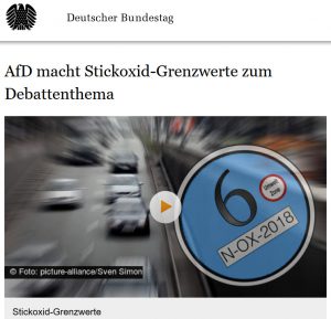 Darüber hinaus solle die Regierung neue Studien zur Wirkung von Stickstoffdioxid in Auftrag geben, um bislang unterbewertete und unberücksichtigte Aspekte zu erforschen und direkte Einflüsse auf den menschlichen Körper besser einschätzen zu können. Ebenso erwartet die AfD von der Regierung eine Änderung des Bundes-Immissionsschutzgesetzes, in dem der EU-Grenzwert für Stickstoffdioxid von 40 Mikrogramm pro Kubikmeter übergangsweise durch den in den USA geltenden Grenzwert von 100 Mikrogramm pro Kubikmeter ersetzt wird. (vom/01.02.2019)