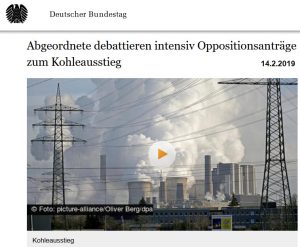 … aus der Kohleverstromung an sich – die Diskussion über das wann, wie und wie teuer indes nimmt gerade erst Fahrt auf, wie eine Debatte im Bundestag am Donnerstag, 14. Februar 2019, verdeutlicht hat. Die Fraktionen AfD, FDP, Die Linke und Bündnis 90/Die Grünen hatten dazu Anträge mit teils gegenläufigen Forderungen eingebracht. Der Antrag der Grünen trägt den Titel „Nach den Empfehlungen der Kohlekommission – Jetzt Einstieg in den Kohleausstieg“ (19/7733) und rief zu einem konkreten Plan für rasche Maßnahmen auf. Der AfD-Antrag ist überschrieben „De-Industrialisierung Deutschlands – Ausstieg aus dem Kohleausstieg“ (19/7720) und zielt auf ein Weiterführen des Kohle-Bergbaus ab. Die Linke tritt dafür ein, den Kohleausstieg schnell und sozial gerecht umzusetzen (19/7703). Die FDP schließlich fordert einen „Kohleausstieg mit Verantwortung und Weitsicht – Sicher, bezahlbar und europäisch“ (19/7696). Der Bundestag überwies alle vier Anträge zur federführenden Beratung an den Ausschuss für Wirtschaft und Energie. Die Linke und die Grünen wollten ihre Anträge direkt abstimmen lassen, wurden von der Koalitionsmehrheit aber überstimmt.