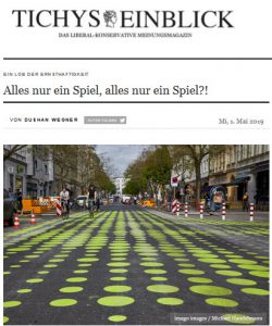 … vom Flughafenbau, über lustige Einwegpunkte auf der Fahrbahn für 146.500 Euro (morgenpost.de, 30.4.2019), von spielerischer Einwanderungspolitik über Inklusionsexperimenten und Integrationsträume bis hin zur Energieversorgung – die »Guten« sind schranken- wie grenzenlos, sie spielen heute auch schon mal ein wenig Weimarer Republik, wenn ihnen danach ist (idowa.de, 27.4.2019, Zitat daraus: »Die Kripo hat gesagt, ich solle da nicht nachhaken.«) – und sie tun immerzu so, als wäre alles nur ein Spiel – womöglich glauben sie es sogar selbst.