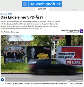 […] Nahles beschwört die großen Zeiten der Sozialdemokratie in Bremen herauf: „Als ich vor 30 Jahren in meinem Dorf in der Eifel in einem tief schwarzen Eck – könnt ihr Euch nicht vorstellen – einen SPD-Ortsverein gegründet habe, da habe ich oben in den Norden geguckt und da stehen diese beiden Worte ‚freie Hansestadt‘ – für mich immer damals schon auch und ich hab mich an Euch auch immer orientiert, für Weltoffenheit, für guten sozialen Zusammenhalt und dafür, dass es hier bei Euch in Bremen keine Rolle spielt – anders als das bei mir damals war – woher man kommt.“[…]