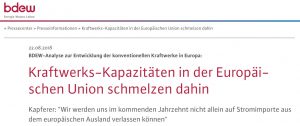 […] Bislang war die Bundesregierung davon ausgegangen, dass in Europa genug Kraftwerke bereitstehen, um nach dem deutschen Atom- und Kohleausstieg Lücken in der deutschen Stromversorgung zu füllen. Eine gefährliche Fehleinschätzung, wie jetzt aus der Studie „Verfügbarkeit ausländischer Kraftwerkskapazitäten für die Versorgung in Deutschland“ hervorgeht. […]