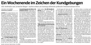 […] Sowohl gegen die Demo der AfD als auch gegen die „stille Meditation“ und gegen die „kritischen Bürger“ hat sich kurzfristig das Bündnis „Solidarität statt Hetze“ gebildet. Dazu gehören unter anderem „Fridays for Future“, Ende Gelände, die Seebrücke und die Grüne Jugend. […]