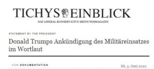 Unten die Rede Donald Trumps zum Tod George Floyds. Ich habe die Übersetzung von Tichy übernommen. Dort finden Sie auch den englischen Originaltext.