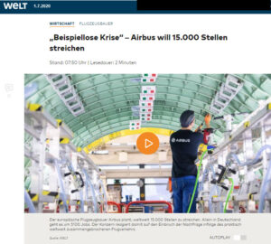 Der Flugzeugbauer Airbus will wegen der Luftfahrt-Krise weltweit 15.000 Stellen streichen. Allein in Deutschland sollen etwa 5100 Stellen betroffen sein, teilte der Flugzeugbauer mit Schaltzentrale im französischen Toulouse mit. „Die Branche befindet sich in einer beispiellosen Krise“, hieß es in einer Mitteilung. Es werde erwartet, dass sich der Luftverkehr nicht vor 2023 erholen werde und möglicherweise erst 2025 wieder auf dem Niveau von vor Corona sein werde.