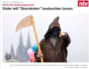 Der Verfassungsschutz sollte sich nach Ansicht des bayerischen Ministerpräsidenten Markus Söder intensiver mit den radikalen Elementen in der „Querdenker“-Bewegung beschäftigen. Ihm bereite die Entwicklung der „Querdenken“-Bewegung gegen die Corona-Maßnahmen große Sorgen, sagte der CSU-Politiker dem „Münchner Merkur“. Die sogenannten Querdenker entwickelten sich „zunehmend sektenartig“. Der CSU-Vorsitzende Söder sprach von einer „Abschottung vor Argumenten und einer Radikalisierung in Blasen“.