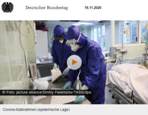 Heftige Gegenwehr kam hingegen von der AfD-Fraktion, die zwischendurch sogar Plakate mit Hinweisen auf das Grundgesetz hochhielt und dafür von Parlamentspräsident Dr. Wolfgang Schäuble ermahnt wurde. Nach Ansicht von Fraktionschef Dr. Alexander Gauland haben die gesetzlichen Regelungen zu einem Vertrauensverlust in der Bevölkerung geführt. Das IfSG stehe für die größte Grundrechtseinschränkung in der Geschichte der Bundesrepublik.