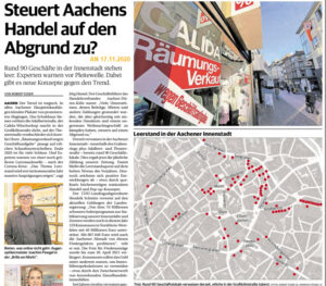 […] Der Trend ist tragisch. In allen Aachener Haupteinkaufslagen künden Plakate von prominenten Abgängen. Das Schuhhaus Siemes verlässt die Adalbertstraße, der Calida-Wäscheshop macht in der Großkölnstraße dicht, auf der Theaterstraße verabschiedet sich Juwelier Horn: „Räumungsverkauf wegen Geschäftsaufgabe“ prangt auf etlichen Schaufensterscheiben. Ende 2020 ist für viele Schluss. Und Experten warnen vor einer noch größeren Leerstandswelle – nach der Corona-Krise. „Das Thema Leerstand wird erst im kommenden Jahr massive Ausprägungen zeigen“, sagt Jörg Hamel. Der Geschäftsführer des Handelsverbandes Aachen-Düren-Köln warnt: „Viele Unternehmen, denen Beiträge, Mieten und andere Zahlungen gestundet wurden, die aber gleichzeitig mit sinkenden Umsätzen und einem ungewissen Weihnachtsgeschäft zu kämpfen haben, steuern auf einen Abgrund zu.“