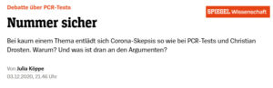 […] Wer sich bei Experten umhört, bekommt den Eindruck: Sie sind die ständigen Diskussionen leid. Kaum ein Labor benutze noch den vom Forschungsteam um Drosten entwickelten PCR-Test in der Form vom Januar. Firmen haben längst eigene Tests entwickelt, die schnell und in großer Zahl durchgeführt werden können. Nur so sind überhaupt so viele Tests möglich. Die ganze Diskussion sei überflüssig. »Die jetzigen Zahlen mit schwer Kranken und vielen Toten führen diese Diskussion doch ad absurdum«, teilte Virologe Ulf Dittmer vom Universitätsklinikum Essen mit. »Wie kann man da jetzt noch diskutieren, dass die PCR nur falsche Ergebnisse liefert?« […]