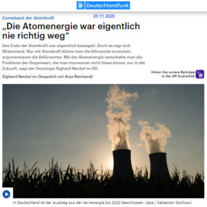„Die Atomenergie war eigentlich nie richtig weg“, sagte Sighard Neckel im Deutschlandfunk. In Frankreich und selbst in Japan habe die Atomenergie auch nach der Reaktorkatastrophe von Fukushima 2011 weiter eine große Rolle gespielt. Der Soziologe meint, dass ein Erreichen der globalen Klimaziele ohne Atomkraft sehr schwierig werde, da man nur noch wenig C02 und wenig Treibhausgase in die Luft ablassen dürfe. „Das ist jetzt der Hintergrund dafür, dass die Atomenergie sich auf einmal wieder so stark ins Spiel gebracht hat, als eine C02-freie Form der Energieerzeugung“, so der Gesellschaftsanalytiker.
