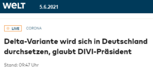 Intensivmediziner rechnen damit, dass sich die zunächst in Indien entdeckte Delta-Variante des Coronavirus in Deutschland durchsetzen wird. „Der große Unsicherheitsfaktor ist gerade die neue Mutation B.1.617.2, die noch ansteckender als die derzeit dominierende Variante B.1.1.7 sein soll. Schrittweise wird sich deshalb auch in den nächsten Wochen diese neue Mutation durchsetzen“, sagte der Präsident der Deutschen Interdisziplinären Vereinigung für Intensiv- und Notfallmedizin (DIVI), Gernot Marx, der „Rheinischen Post“.