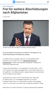 Frei argumentierte außerdem, in den vergangenen fünf Jahren seien nur etwa 1.000 Menschen nach Afghanistan abgeschoben worden. Dabei habe es sich um Terrorgefährder und Straftäter gehandelt. Insgesamt gebe es hierzulande derzeit 30.000 ausreisepflichtige Afghanen.