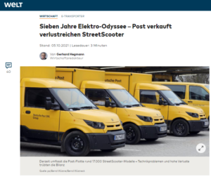 Die Deutsche Post hat endlich jemanden gefunden, der ihr das verlustreiche Geschäft mit dem Bau der Elektro-Kleintransporter „StreetScooter“ abnimmt. Nach WELT-Recherche wurde Mitte September in Luxemburg das Unternehmen Odin Automotive gegründet. Es will jetzt alle Anteile an der Post-Tochter StreetScooter Engineering mit Sitz in Aachen übernehmen, geht aus einer Anmeldung beim Bundeskartellamt hervor. An der Spitze von Odin steht als Hauptgesellschafter der Manager Stefan Krause, der bereits Vorstand bei BMW und der Deutschen Bank war.