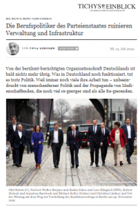 Die FDP hätte sich durchgesetzt, wurde behauptet, um den tatsächlichen Kniefall der einstigen Partei der Freiheit zu vertuschen. Die FDP hat nichts, aber auch gar nichts Handfestes, außer der Verhinderung des Tempolimits, in diesen Vertrag eingebracht. Die Beteuerungen, keine neuen Schulden aufzunehmen und die Steuern nicht zu erhöhen, waren reine Ablenkungsmanöver. Die Schulden, die Finanzminister Lindner aufnimmt, werden einfach in Sondervermögen umbenannt. Wer die FDP in der Hoffnung auf bürgerliche Restvernunft gewählt hat, sollte besser der Tatsache ins Auge sehen, dass die Lindner-Partei ebenso entkernt ist wie die Union. Sie ist nur noch ein Erfüllungsgehilfe der Grünen.