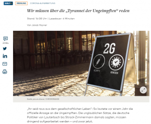 Dieser Mann hat den Artikel zum Thema der angeblichen „Tyrannei der Ungeimpften“ geschrieben. Ein Thema, das an finsterste Zeiten in Deutschland erinnert. Hier sein Artikel: