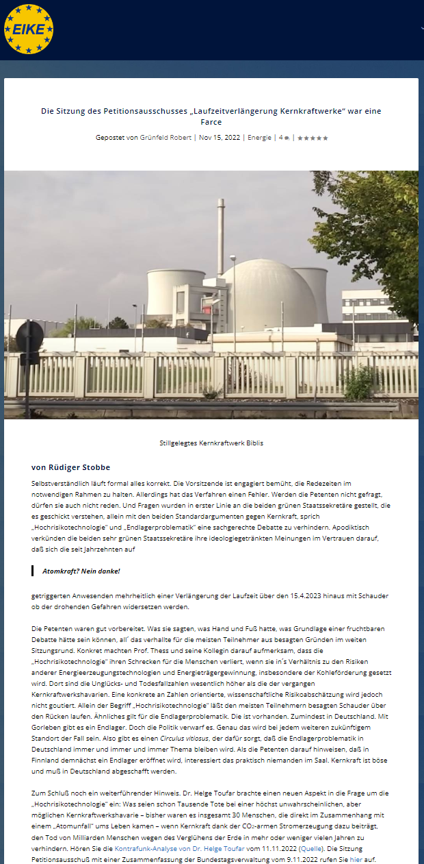 Zum Schluß noch ein weiterführender Hinweis. Dr. Helge Toufar brachte einen neuen Aspekt in die Frage um die „Hochrisikotechnologie“ ein: Was seien schon Tausende Tote bei einer höchst unwahrscheinlichen, aber möglichen Kernkraftwerkshavarie – bisher waren es insgesamt 30 Menschen, die direkt im Zusammenhang mit einem „Atomunfall“ ums Leben kamen – wenn Kernkraft dank der CO2-armen Stromerzeugung dazu beiträgt, den Tod von Milliarden Menschen wegen des Verglühens der Erde in mehr oder weniger vielen Jahren zu verhindern. Hören Sie die Kontrafunk-Analyse von Dr. Helge Toufar vom 11.11.2022 (Quelle). Die Sitzung Petitionsausschuß mit einer Zusammenfassung der Bundestagsverwaltung vom 9.11.2022 rufen Sie hier auf.