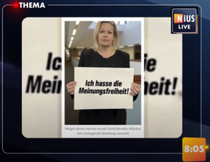 ▶️ Die Anzeigenwut der Bundesregierung geht unvermindert weiter. Wegen eines Memes über Innenministerin Nancy Faeser wurde der Chef des „Deutschland-Kuriers“ zu 7 Monaten Haft auf Bewährung verurteilt.