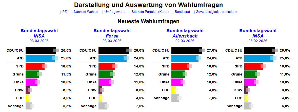 🔍 Inhalt: Am 03. Januar 2026 veröffentlichte das Meinungsforschungsinstitut INSA im Auftrag von BILD am Sonntag eine neue Bundestagswahl-Umfrage. In diesem Video schaue ich mir die Ergebnisse im Detail an, rechne die Sitzverteilung im Bundestag aus und bespreche die spannendsten Koalitionsoptionen. Auffällig: Die AfD liegt mit 26 % klar auf Platz 1 und baut ihren Vorsprung gegenüber der Bundestagswahl vom 23.02.2025 deutlich aus. Die CDU/CSU steht bei 25 %, verliert aber ebenso wie die SPD. Linke und Grüne können hingegen zulegen, während BSW und FDP an der 5-Prozent-Hürde scheitern würden.