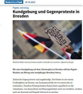Am 3. Oktober 2016 rufen rechte, „undankbare“ Pöbler – natürlich aus Sachsen – „Merkel muss weg“, „Volksverräter“ und all´ die Sachen, die vielleicht nicht schön in den Ohren unserer Politikeliten und Claudia Roth klingen, da ist schon der große Aufriss in allen Medien da. Auf einmal sind Begriffe wie „Anstand“ und „Respekt“ wieder ´in`.