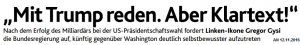 ist ein begnadeter Rhetoriker. Er kann die Welt erklären. Er weiß, wie die Welt sein müsste, wenn sie solidarisch, gerecht und gleich sein sollte. Nämlich solidarisch, gerecht und gleich. _____________________________________________ Gregor Gysi hat sich zur Wahl in den USA, den Rechtspopulismus in Deutschland, in Europa geäußert. In den Aachener Nachrichten. Interviewer ist Joachim Zinsen. _____________________________________________ Es gab in Deutschland schon einige begnadete Rhetoriker. Einer hat dem Land überhaupt nicht gut getan. Auch wenn er glaubte, dass die Vorsehung auf seiner Seite gewesen ist. _____________________________________________ Gregor Gysi behauptet im Interview: „[…] Vor allem aber brauchen wir im Kampf gegen die AfD einen sozialen Schub. Das versuche ich auch immer wieder Unternehmern klarzumachen. Ohne eine Steuergerechtigkeit und ohne größere soziale Gerechtigkeit werden wir die AfD politisch nicht überwinden können. […].“ Das ist m. E. nicht richtig. Lange Jahre konnten Menschen mit den Guten Gedanken all´ das machen, was ihnen richtig erschien, z. B.: Ganz viele Menschen wollen das nicht. Sie sind weder abgehängt noch doof. Sie glauben nicht, das Regen von unten nach oben fällt. Sie wollen ein sicheres, ruhiges Leben. Am besten in einer normalen bürgerlichen Familie. In Deutschland. In erster Linie unter Menschen, die sich verhalten, wie in Deutschland (noch) üblich. Viele Menschen merken, das Patchwork nur Krücke ist. Der massive Anstieg der Zahlen verhaltensgestörter Kinder in Kindergarten und Schule spricht eine deutliche Sprache. Selbstverständlich wollen sie eine anständige Bezahlung. Doch das alleine reicht eben nicht. Natürlich sind solche Menschen in den Augen unserer Menschen mit den Guten Gedanken „Rechts“. Sie sind rassistisch und schon nahe am, nein, im Nationalsozialismus angekommen. Die Menschen mit den Guten Gedanken haben offensichtlich keine Ahnung von Rassismus und Nationalsozialismus. Die Begriffe „Rechts“, „Nazi“, „Rassist“ usw. werden von ihnen als Totschlagbegriffe verwendet. Menschen, die die Guten Gedanken unserer Menschen mit den Guten Gedanken nicht teilen, sollen damit diskreditiert werden. Doch die Begriffe sind leere Hüllen. Sie schrecken nicht. Im Gegenteil. Der häufige und vollkommen ungerechtfertigte Gebrauch dieser Totschlagbegriffe verharmlost die Taten wirklicher Rassisten und Nationalsozialisten, die Deutschland, Europa, die Welt in Tod und Verderben geführt haben. ____________________________________________ Ein guter Rhetoriker ist noch lange kein guter Praktiker. ____________________________________________