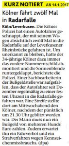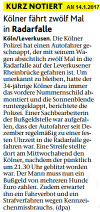 Ich bin froh, dass der Kölner mit den Radarverstößen seiner gerechten Strafe inkl. Führerscheinentzug plus Idiotentest zur Wiedererlangung desselben irgendwann einmal , dass er dieser schreckliche Mann und Feind des Staates der Bestrafung zugeführt wird.