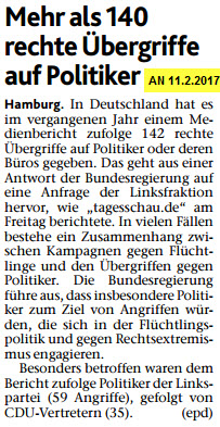 231 Straftaten bezogen auf etwa 65.000.000 Deutsche ohne Migrationshintergrund – andere Täter kommen ganz sicher nicht in Frage – macht 0,000355 % . Nun kommen die 1.000 Anschläge auf die Flüchtlingsheime noch hinzu. Da sind es dann 0,0019 % . Klar, ist schon erheblich. Zumal ein großer Teil der Anschläge aus Schmierereien, also Propaganda, besteht.