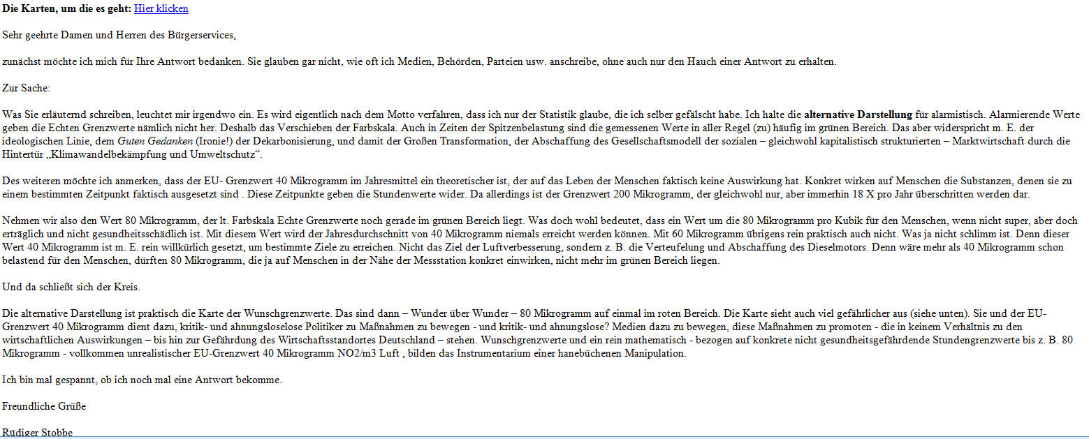 Vergleichen Sie die beiden „Grenzwert“maßstäbe. Sie werden sehen, dass in der alternativen Darstellung, der Jahresdurchschnittsgrenzwert von 40 Mikrogrammzufälligerweise zum quasi ´Wunschgrenzwert Stundenmessung` wird.