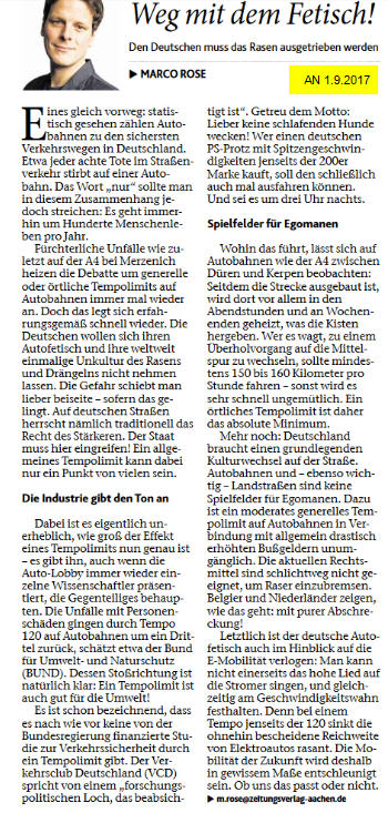 Ich persönlich befürworte 130 km/h auf Autobahnen generell und fahre auch heute nicht schneller, wenn ich mir mal ein Auto z. B. für den Urlaub leihe (Cambio). Ich besitze nämlich kein eigenes.