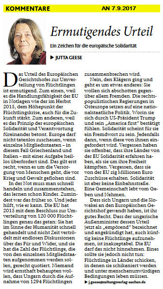 Da hat sich wohl kein EU-Staat mit Ruhm bekleckert. Einige haben geklagt. Nicht gegen die Aufnahme von Flüchtlinge. Gegen einen starren Verteilschlüssel, der zur Folge haben könnte, dass bei ungebremsten Zustrom von Menschen, die ganze Sache außer Kontrolle gerät.