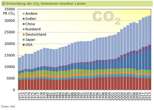 Auch wenn von 2014 bis 2016 der CO2-Ausstoß weltweit nicht angestiegen sein soll, 2017 ist es wieder so weit. Der Anstieg bis 2013: Hier klicken