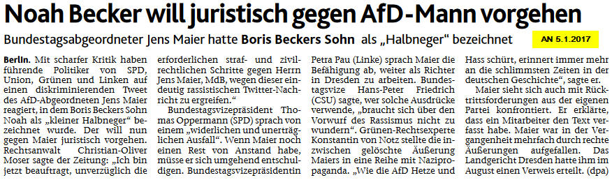 Womit wir bei Jens Maier, Richter in Dresden und AfD-Bundestagsabgeordneter, wären. Der hat doch glatt in einem Tweet, den Boris-Becker-Sohn Noah als „kleinen Halbneger“ bezeichnet.