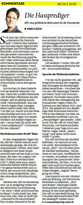 Da hilft es auch nichts, die AfD in braune Nazi-Ecke zu stellen, wie es oben Herr Malzahn tut. Die meisten seiner Leser goutieren dies durchaus nicht.
