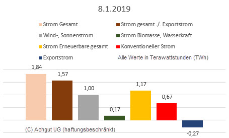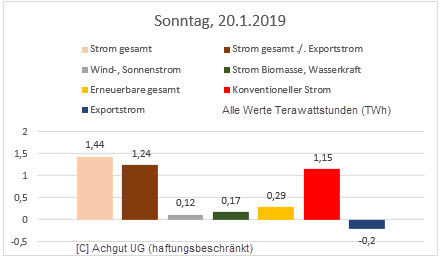 Obwohl sich die Windstromproduktion gegenüber dem 21.1.2019 mehr als verdoppelt, trotz Biomasse und Wasserkraft werden nicht mal 30 % Anteil Erneurbare an der Gesamtstromproduktion (1,84 TWh) erreicht. Der Nettostrombedarf in Deutschland lag an diesem Tag bei 1,59 TWh. Also wurden 0,25 TWh exportiert.