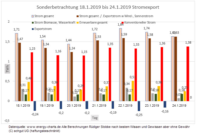 Das schöne Winterwetter, dass sich am Freitag der 3. Woche bereits andeutete, hielt an. Sonnenschein und sehr oft fast kein Wind. Dabei angenehme Temperaturen etwas höher als der Gefrierpunkt. Leider kein Wetter für die Energieträger Wind und Sonne. Diese Sonne steht im Winter tief, hat wenig Kraft. Der Wind ruht weitgehend. Folge: Kaum Strom durch Wind und Sonne. Schauen Sie sich die Tabelle mit den detaillierten Zahlen an. Bitte insbesondere auch die Ex- und Importdaten vom 24.1.2019. Das ist wichtig, weil am 24.1.2019 auf den ersten Blick gemäß des aus der Tabelle entwickelten Charts kein Strom exportiert wurde. Dieser Eindruck ist nicht richtig. Lediglich der Saldo beträgt 0 TWh. Faktisch wurden 0,05 TWh importiert und 0,05 TWh exportiert. Hier nun die Wochenanlyse. Klicken Sie auf das Tagesdatum und das jeweilige Chart klappt auf.