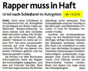 Ramadan auftreten sollten. Der Streit war schließlich so eskaliert, dass die beiden Gruppen mit Macheten, Eisenstangen und Baseballschlägern aufeinander losgegangen sind. Durch die Schüsse waren zwei Männer jeweils am Oberschenkel verletzt worden. Einer von ihnen war sogar einer der Mitangeklagten. Quelle: Bericht rechts