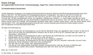 1933 waren es die Juden, die Sozialdemokraten und die Kommunisten, die das Deutsche Reich ruinierten, heute sind es die Islamisten, Migranten und im Allgemeinen alle Ausländer, die nach ihrer Aussage „unserem“ Land großen Schaden zufügen. In der Öffentlichkeit treten sie auf wie falsche Magier, die mit ihrer Rattenfängerflöte blasen, um die Scharen der Massen für ihre radikalen Ziele zu begeistern. Nur langsam lassen sie die Katze aus dem Sack. Die Redner in ihren Versammlungen und bei ihren Demoveranstaltungen outen sich zusehends und immer lauter. Selbst die Abgeordneten in den Parlamenten haben keine Scheu, ihr wahres Gesicht zu zeigen. Oder wie ist die Kleine Anfrage im Deutschen Bundestag am 22. März 2018 zu verstehen? (Anm. d. Red.: Die Kleine Anfrage ist im Internet unter: dipbt.bundestag.de/dip21/btd/19/014/1901444.pdf nachzulesen, die Antwort unter: dipbt.bundestag.de/dip21/btd/19/016/1901623.pdf) Hier nimmt die AfD-Bundestagsfraktion im Parlament Menschen mit Schwerbehindertenausweis ins Visier. Ihre Anfrage zielt auf „unwertes Leben“ von schwerbehinderten Menschen. Insbesondere sind in der Anfrage Mutmaßungen zu den Auswirkungen inzestuöser Verhältnisse innerhalb von Migrantenfamilien enthalten.