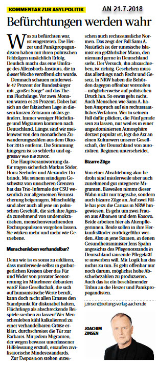 Die Hauptverantwortung dafür tragen sicherlich Markus Söder, Horst Seehofer und Alexander Dobrindt. Mit seinem ständigen Geschwätz von unsicheren Grenzen hat das Trio-Infernale der CSU wesentlich zur allgemeinen Verunsicherung beigetragen. Mitschuldig sind aber auch all jene im politischen Geschäft, die sich ihre Agenda zunehmend von undemokratischen, menschenverachtenden Rechtspopulisten vorgeben lassen. Sie wirken mehr und mehr wie Getriebene.