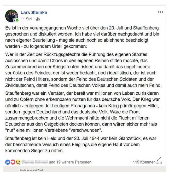 zu 1. Da meint ein Landesvorsitzender der AfD-Jugendorganisation ´Junge Alternative` , der Mann – Graf Schenk von Stauffenberg – sei ein „Verräter“. Er begründet dies in einem Facebook-Post (unten rechts). Und ich muss sagen, dass diese Sichtweise für mich, der jahrzehntelang mit „Stauffenberg=Widerstand=Held“ alle Jahre wieder konfrontiert wurde, neu ist.