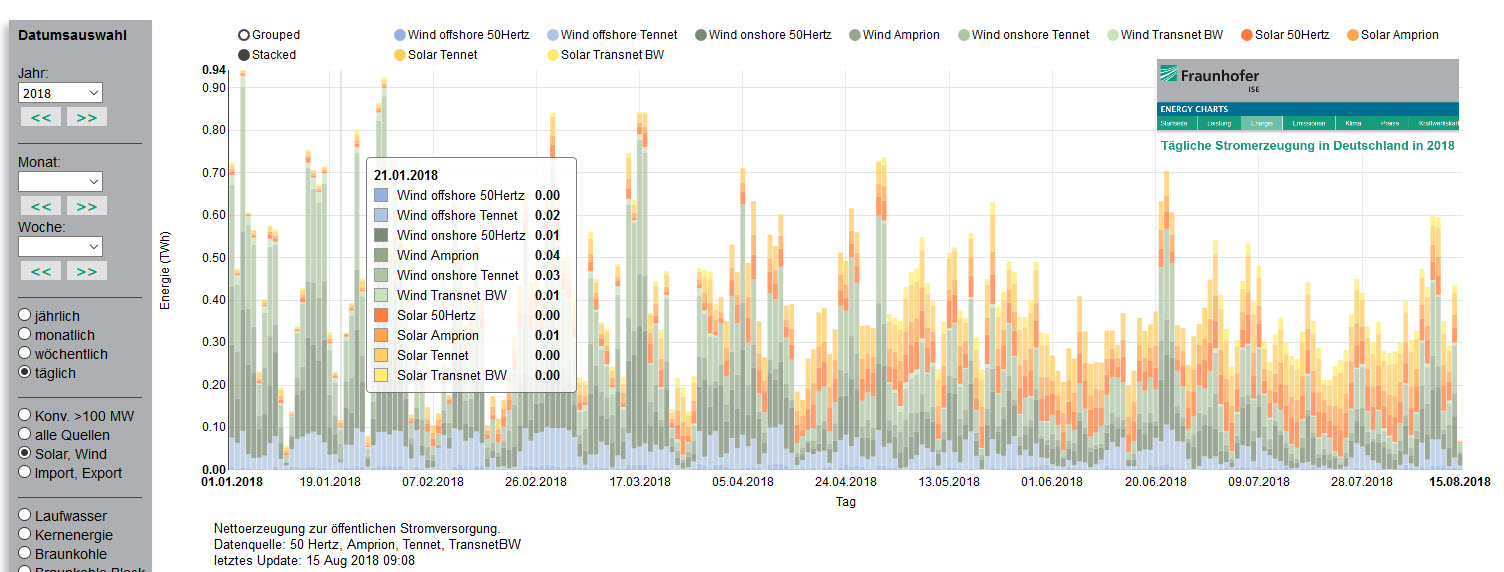 Wie Schaubild 1 aber auch zeigt, waren es am 21.1.2018 exakt 0,12 TWh von 1,29 TWh insgesamt erzeugtem Strom an diesem Tag. (Nachdem Sie die Gesamtstromseite aufgerufen haben, gehen Sie mit dem Mauszeiger auf den 21.1.2018. Die Summe aller Stromerzeuger ergibt die 1,29 TWh!)