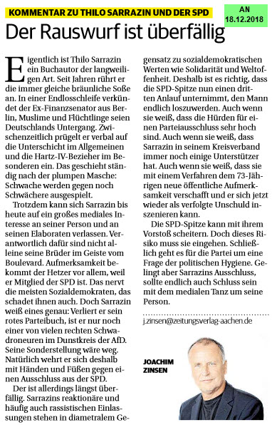 Wenn ich obiges lese, habe ich den Eindruck, dass es eher die intellektuelle Unfähigkeit Herrn Zinsens ist, die verhindert, sich sachgerecht mit dem (Gesamt-) Werk von Dr. Thilo Sarrazin auseinanderzusetzen.
