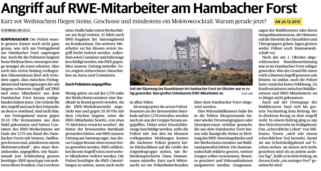 Als wenig später die ersten Polizeibeamten an der brennenden Barrikade auf der L276 eintrafen, wurden auch sie aus der Gruppe heraus angegriffen. Dabei seien Einsatzfahrzeuge beschädigt worden, teilte die Polizei mit. Aus den im Moment vorliegenden Meldungen konnte die Aachener Polizei gestern keine Rückschlüsse auf die Größe der Angreifergruppe ziehen, wie Behördensprecherin Dana Zimmermann mitteilte. Kurz nach Mitternacht sei ein Polizeihubschrauber über dem Hambacher Forst eingesetzt worden. […]