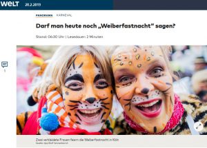 Darf man eigentlich noch „Weiberfastnacht“ sagen – wo „Weiber“ heute doch ein herabwürdigender Begriff ist? Für das Festkomitee Kölner Karneval ist die Sache klar: „Weiberfastnacht oder auch Wieverfastelovend ist im Karneval der Tag, an dem die Frauen seit Jahrhunderten die Macht übernehmen“, sagt Sprecherin Tanja Holthaus. „Man könnte also fast sagen: Weiberfastnacht ist für uns Frauen hier in Köln der höchste Feiertag.“