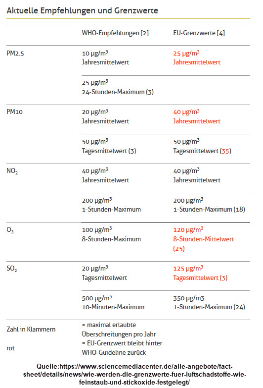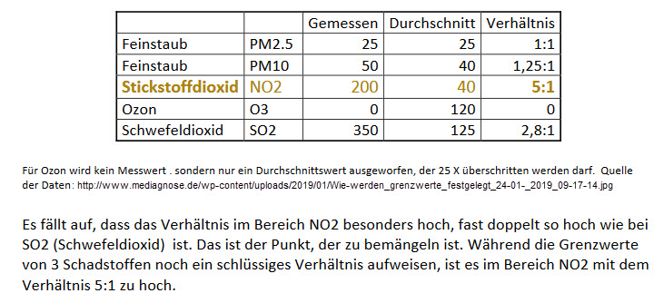 - Die Erläuterung des früheren Schulnotensystems zeigt, dass die Grenze zwischen Versetzung/Nichtversetzung bei einer 4,0 im Durchschnitt liegt. 4,1 bedeuten Sitzenbleiben. Wenn wir zwecks Veranschaulichung die tatsächlich an der Messtelle erlaubten 200 µg NO2 in Noten aufteilen, wären 0 µg NO2 „Sehr gut“ = 1. „Ungenügend“ = 6 wären die 200 µg. Alle anderen Noten liegen in 40 µg – Schritten dazwischen. „Ausreichend“ = 4 wären 120 µg NO2. Das sind realistische Annahmen. Auch wenn lt. Gesetz sogar die 200 µg noch ausreichend wären. Unser Schulnoten-Beispiel zeigt, dass zwischen der Höhe des tatsächlich die Wirklichkeit wiederspiegelndem Stundenmessgrenzwert 200 µg NO2 und dem theoretisch ermittelten Jahresdurchschnittsgrenzwert 40 µg NO2 ein viel zu großer Unterschied besteht. Um im Bild zu bleiben, müsste ein Schüler im Durchschnitt immer eine 2 haben, um versetzt zu werden. In jedem Fach eine 4 oder auch eine 3, ja sogar alles 2-er und nur eine 3 würden nicht ausreichen, um versetzt zu werden. Die Schüler würden zu Recht auf die Barrikaden gehen. Der Durchschnitt beim NO2 muss immer wenigstens 2,0 sein. 41 µg = 2,05 reichen nicht. Fahrverbot droht! Bemerkenswerterweise ist nur beim Grenzwert NO2 das Verhältnis zwischen Stunden- und Jahresdurchschnittsgrenzwert so hoch. Bei anderen Luftschadstoffen, die von der EU wesentlich weniger streng übernommen wurden, als von der WHO empfohlen, ist das Verhältnis korrekt. Das Verhältnis bei NO2 hielte einer strikten wissenschaftlichen Überprüfung m. E. nicht Stand. Seit der Epidemiologe Prof. Wichmann frank und frei erläutert hat, dass bei der Festsetzung von Grenzwerten im Bereich Luftschadstoffe auch Willkür im Spiel sei, die Grenzwerte also politische Grenzwerte seien, wurde meine Vermutung, dass der Grenzwert vor allem dazu gedacht sei, politisch gewollte „Umweltveränderungen“ durchzusetzen, eindrucksvoll bestätigt. Ein wissenschaftlich haltbarer Jahresdurchschnittsgrenzwert sollte zwischen 80 und 120 µg liegen.