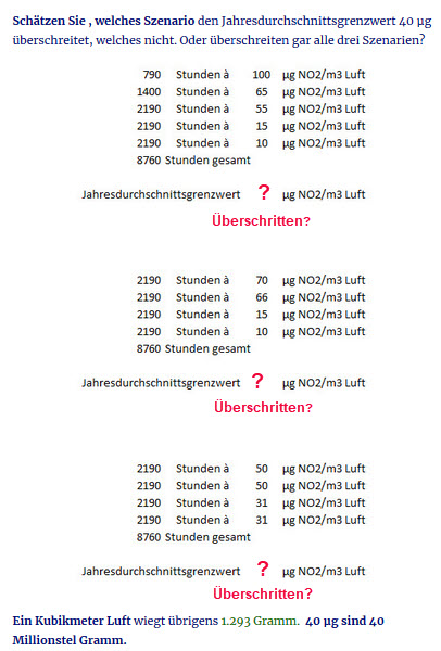 Zum Schluss eine kleine Schätzaufgabe zum Durchschnittswert 40 µg NO2 / m3 Luft. Bitte schätzen Sie spontan: Hier die Aufgabe, hier die Lösung. Sie werden sehen, dass Durchschnittswerte nicht unbedingt etwas mit der tatsächlichen Belastung der Bürger durch einen Schadstoff zu tun haben müssen. Entscheidend sind die Werte, die tatsächlich gemessen werden. Das ist bei NO2 der Stundenmesswert. 200 µg NO2 stehen im Gesetz. Bis zu 200 µg NO2 sind für Menschen, wenn sie diesem Wert nicht dauerhaft ausgesetzt sind, gesundheitlich unbedenklich. Sonst wäre der Wert niedriger. Damit die Menschen den 200 µg NO2 nicht dauerhaft ausgesetzt werden, gibt es den Jahresdurchschnittsgrenzwert. Der allerdings sollte zur Höhe des Stundengrenzwertes in einem plausiblen Verhältnis stehen. Das viel zu hohe Verhältnis 5:1 ist m. E. ausschließlich politisch motiviert.