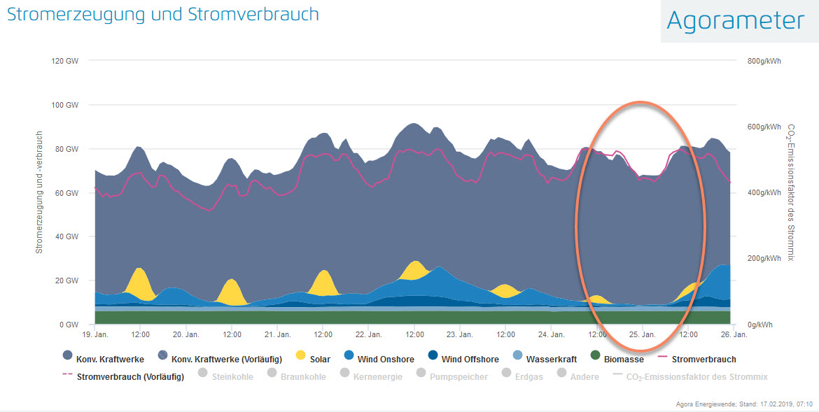Sollte die Reserve dennoch wie am 24.1.2019, 12:00 Uhr, bis zum 25.1.2019, 12:00, Uhr nicht reichen, wird Strom aus dem europäischen Ausland importiert. So der Strom dort erübrigt werden kann. Was umso unsicherer ist, desto mehr Erneuerbare auch die Nachbarländer haben werden. Dann wird die Stromdecke dünn. Sehr dünn. Heute aber erzeugen unsere Nachbarn zum Glück mit Kohle und Kernenergie den Strom. Ich wiederhole: Zum Glück!