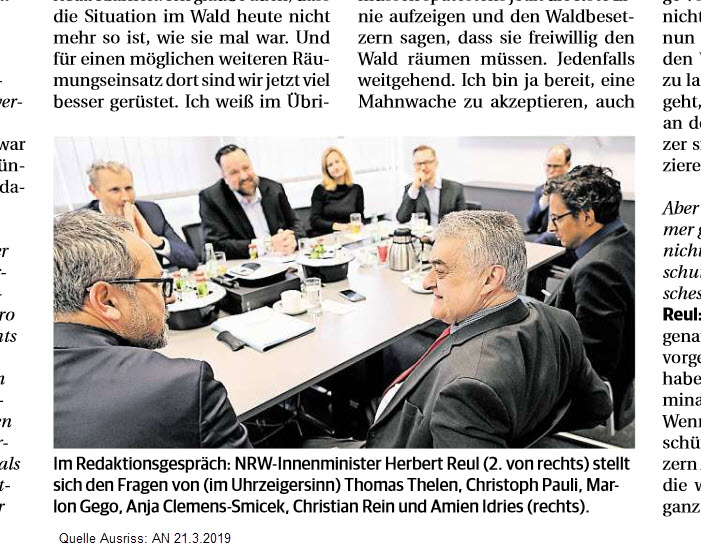 Reul: Klarheit. Ich glaube auch, dass die Situation im Wald heute nicht mehr so ist, wie sie mal war. Und für einen möglichen weiteren Räumungseinsatz dort sind wir jetzt viel besser gerüstet. Ich weiß im Übrigen auch gar nicht, warum gerade ich mich rechtfertigen muss. Rechtfertigen müssen sich doch eigentlich die Menschen, die trotz klaren gerichtlichen Verbots wieder in den Wald gegangen sind. Warum lassen es die bürgerlichen Klimaschützer eigentlich zu, dass ihr Anliegen, das ja durchaus ehrenhaft ist, von anarchischen Kräften derart diskreditiert wird?