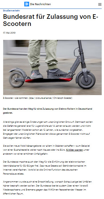 Allerdings gibt es einige Änderungen am ursprünglichen Entwurf. Demnach sollen die Gefährte generell erst für Jugendliche ab 14 Jahren erlaubt werden und nicht bei langsameren Modellen schon ab 12 Jahren, wie zunächst vorgesehen. Entgegen der ursprünglichen Pläne sollen die so genannten E-Scooter nicht auf Gehwegen fahren dürfen.