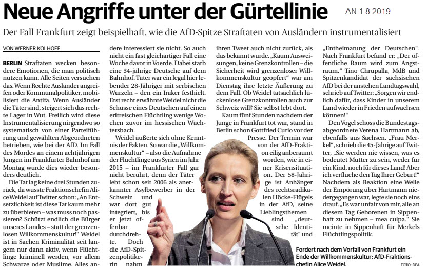Dr. Curio gibt eine Pressekonferenz, er kommentiert – siehe unten – den aktuellen Vorfall im Gesamtzusammenhang; Alice Weidel äußert sich zu dem grauenhaften Vorfall. Die beiden Protagonisten der AfD haben alles Recht der Welt dazu. Warnen doch sie, warnt doch die AfD seit Jahr und Tag vor der unkontrollierten Zuwanderung und deren Folgen unter Missachtung geltenden Rechts.