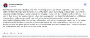 „Björn Höcke („Mahnmal der Schande“), in der Mitte der AfD (sagt Gauland, der mit dem „Vogelschiss“), also Horror-Höcke, Spitzenkandidat in Thüringen einer demokratisch gewählten Partei … das is ja gruselig! Ein echter Fascho, auferstanden aus Ruinen und den Nazis zugewandt. 24 Prozent. Und viele sagen immer noch: Das wird sich niemals wiederholen – aber seht ihr denn nicht an den Häuserwänden die selben alten neuen Parolen? Und die gleiche kalte Kotze (wie vor 80 Jahren) schwappt ihnen wieder aus dem Mund …“